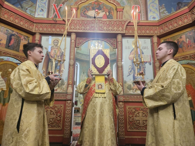 На полиелее Правящий Архиерей прочёл воскресный отрывок из Евангелия от Марка (Мк. 16:9–20), повествующий о явлении Христа Воскресшего Марии Магдалине.