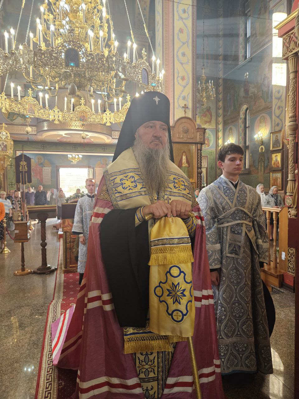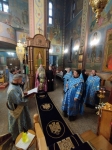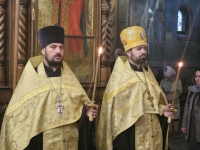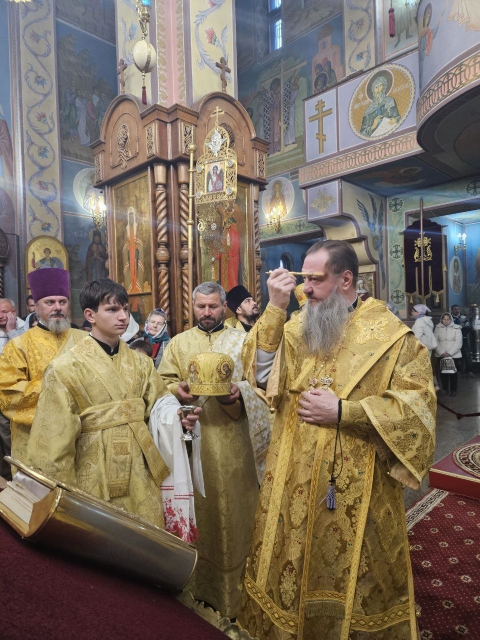 Его Высокопреосвященству сослужили ключарь собора протоиерей Павел Кузменых, клирики собора: протоиерей Георгий Скобиль, диакон Геннадий Гнатюк и проходящий богослужебную практику иеродиакон Никанор (Цверкун).