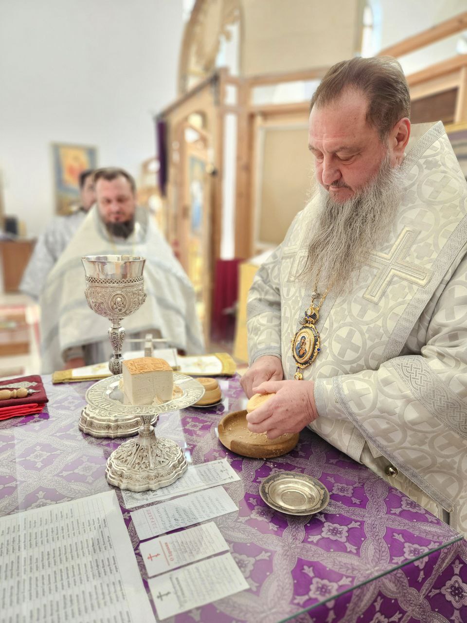 Его Высокопреосвященство также огласил расписание богослужений на предстоящую седмицу и совершил помазание освящённым елеем духовенства и всех молившихся за богослужением.