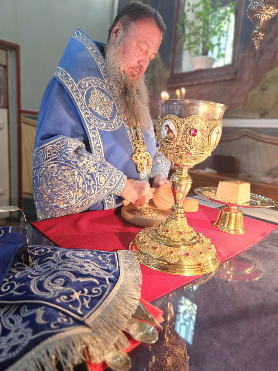 Согласно церковному уставу, за Всенощным бдением совершалось последование литии – часть богослужения, совершаемая в притворе храма. За литиёй благословляются хлебы, пшеница, вино и елей, а хлеб, напоённый вином, затем раздаётся прихожанам после помазания.