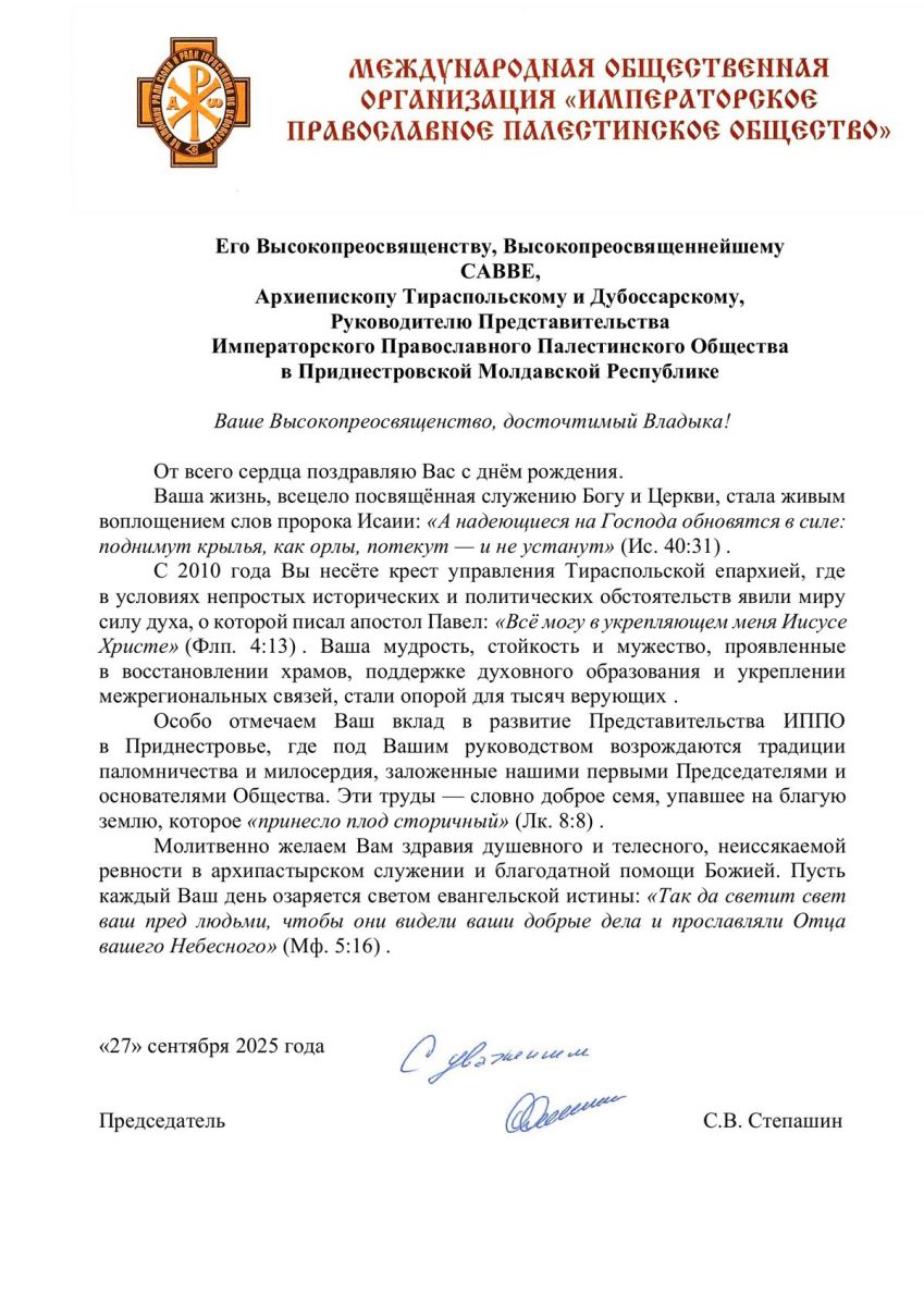 С юбилеем архиерейской хиротонии архиепископа Тираспольского и Дубоссарского Савву поздравил председатель Императорского Православного Палестинского общества (ИППО), известный государственный и общественный деятель, экс-премьер-министр России Сергей Вадимович Степашин, который направил владыке приветствие от имени ИППО.