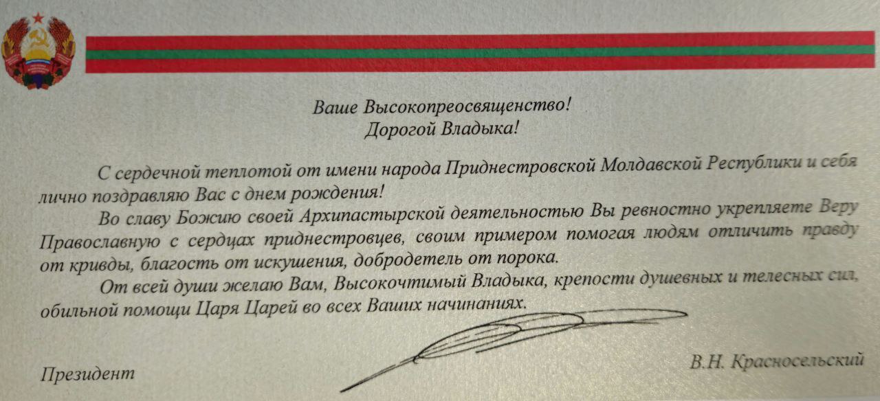 Поздравление в адрес Его Высокопреосвященства направили президент ПМР В.Н. Красносельский и Председатель ИППО С.В.Степашин.