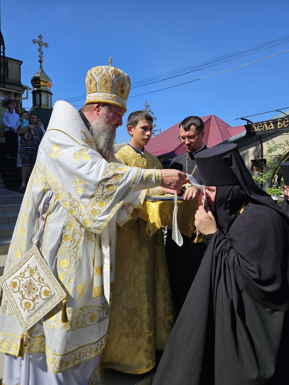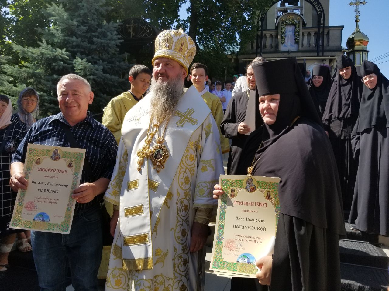 По окончании крестного хода Правящий Архиерей вручил игумении Елисавете (Василаке) в благословение руководимой ею обители закладку для Святого Евангелия. После этого архиепископ Савва обратился к богомольцам со словами архипастырского назидания, призвав прибегать в молитвах ко святым апостолам Петру и Павлу, поучаясь примером их многотрудного жития, и вручил ктиторам, благотворителям и помощникам монастыря в благословение за труды во славу Святой Церкви медаль Покрова Пресвятой Богородицы и благословенные Архиерейские грамоты.