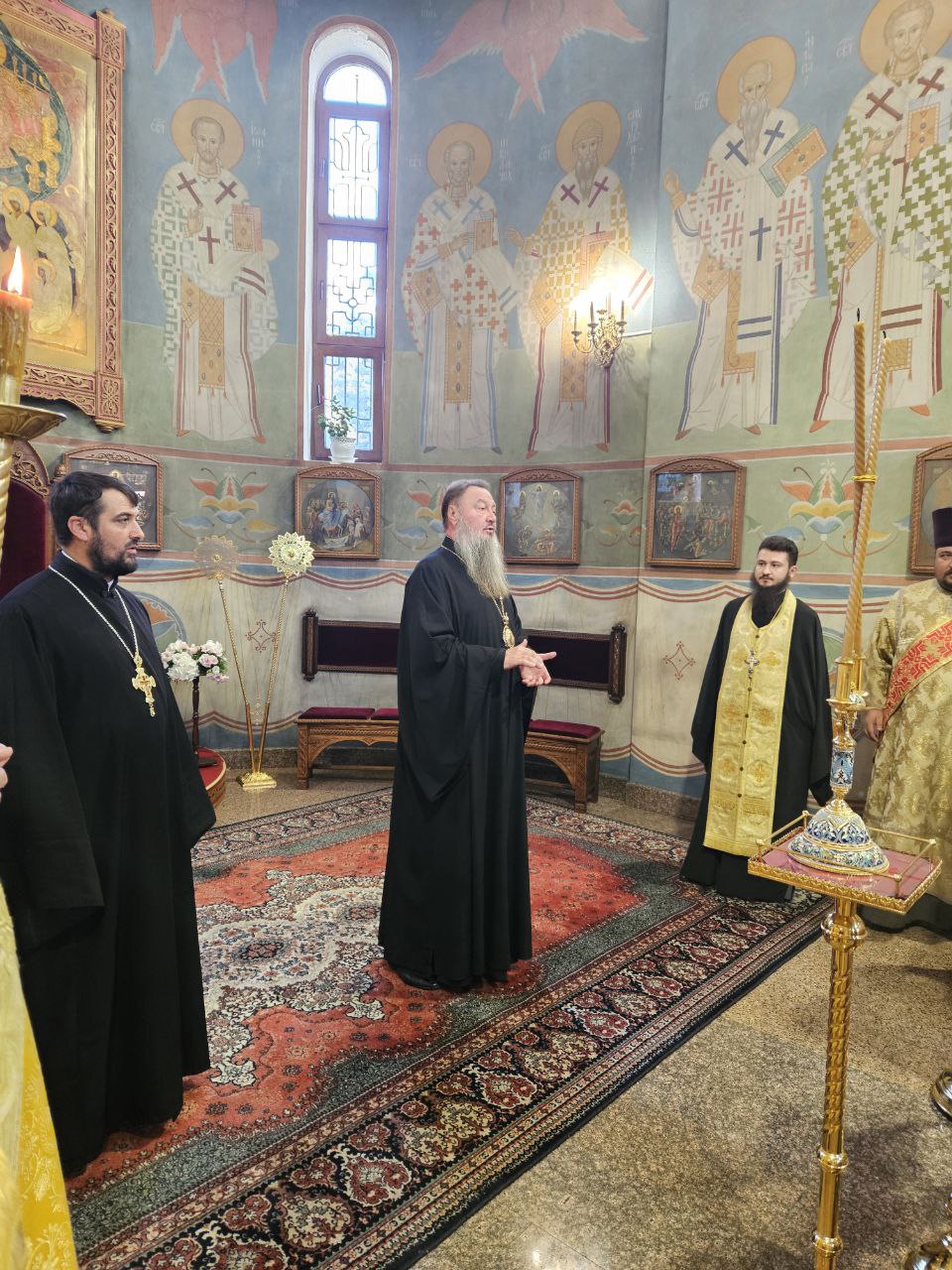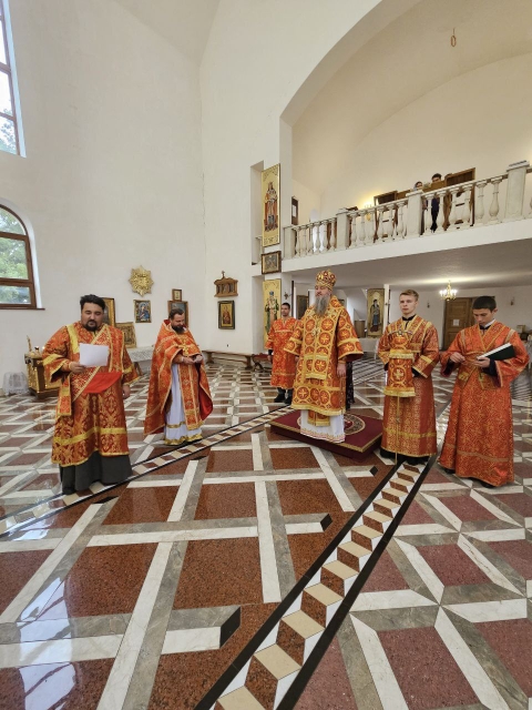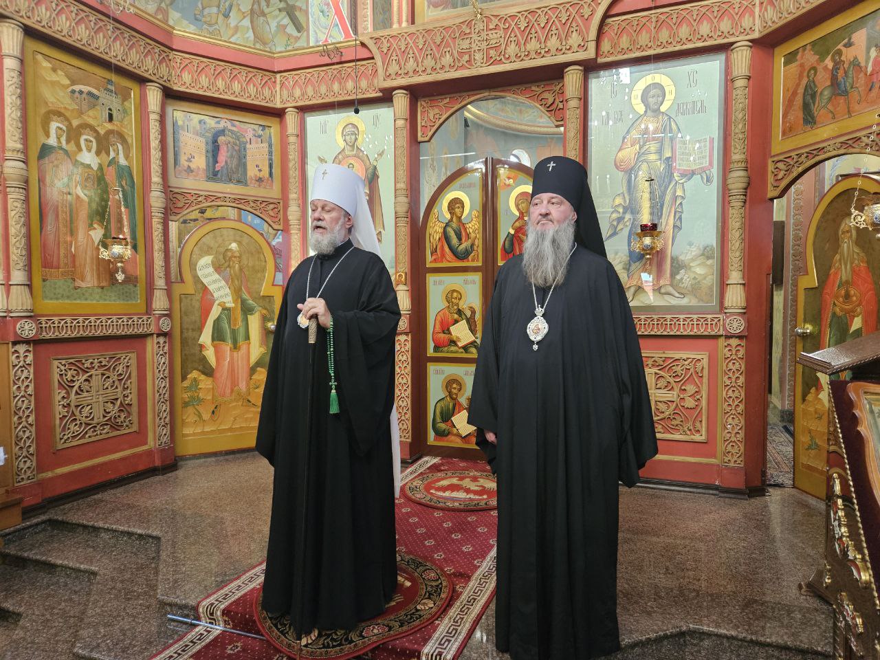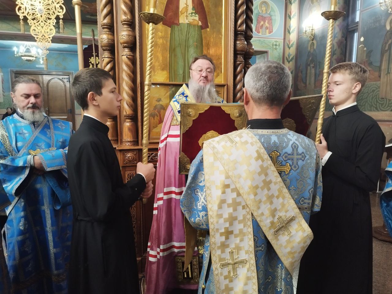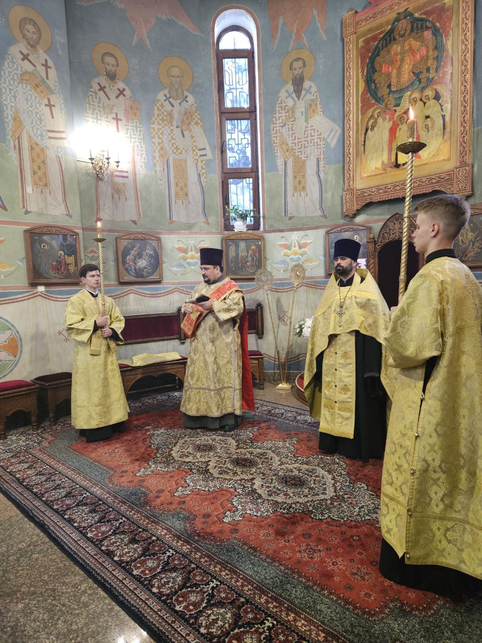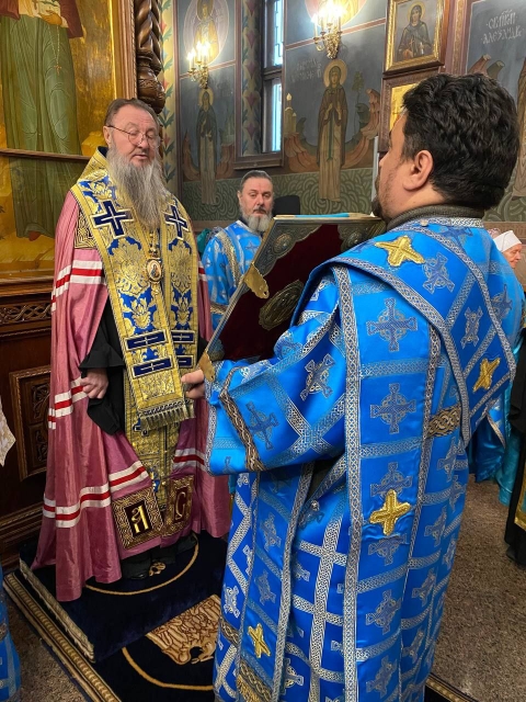 Высокопреосвященнейшему Владыке сослужили соборный причт, а также клирик храма Покрова Пресвятой Богородицы протоиерей Николай Чепель, настоятель храма Новомученников и исповедников Российских протоиерей Георгий Лесник и проходящий богослужебную практику иеродиакон Никанор (Цверкун).