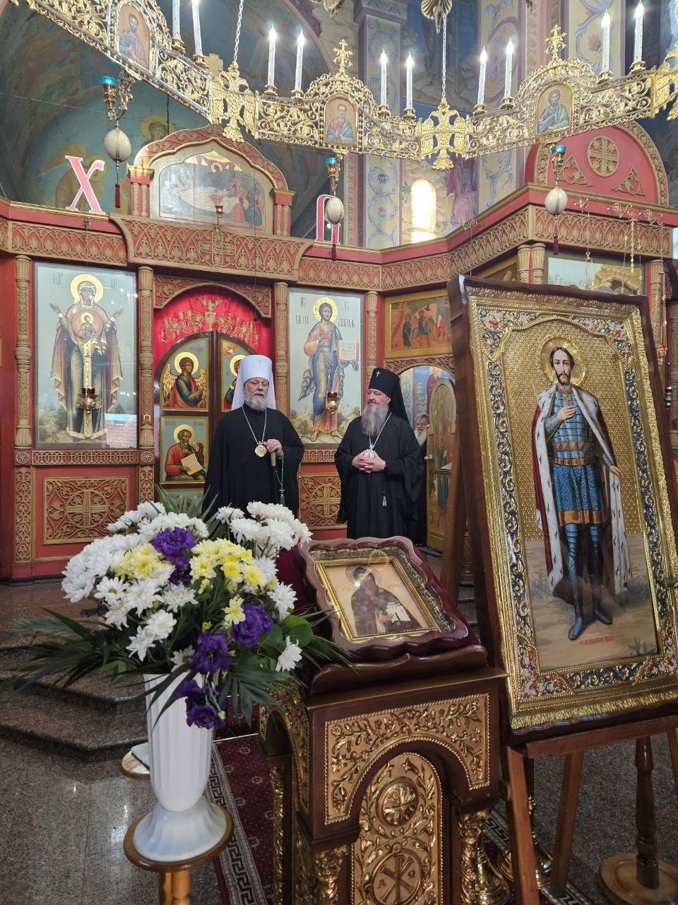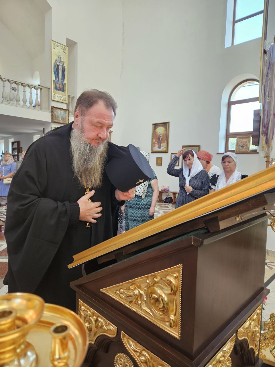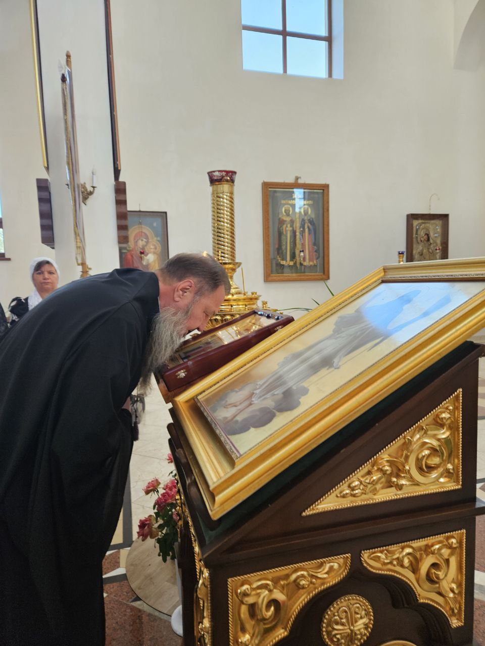 По завершении Божественной Литургии было совершено славление перед образом прп. Сергия, игумена Радонежского. После чего с приветственным словом к Правящему Архипастырю обратилился настоятель Александро-Невского храма протоиерей Михаил Лугну.