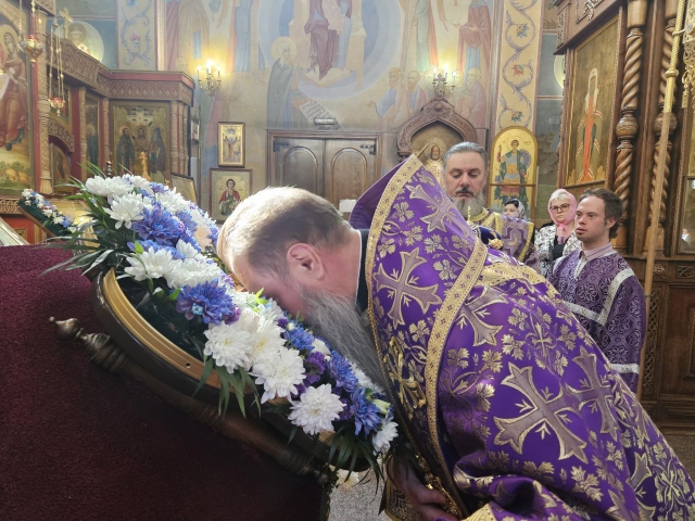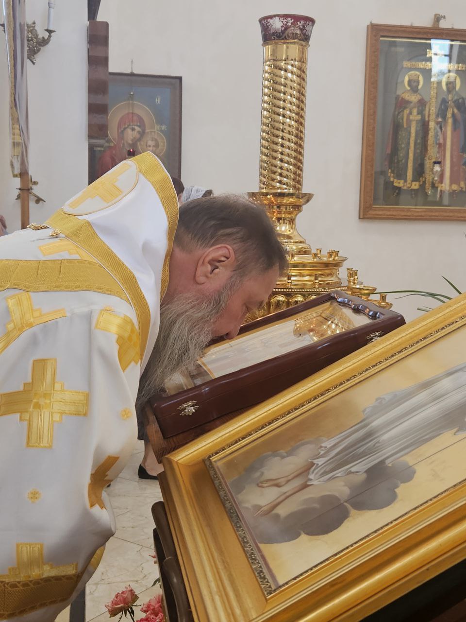 По завершении акафиста Его Высокопреосвященство вознёс молитву ко Пресвятой Богородице, после чего с благоговением поклонился образу Царицы Небесной. Вслед за этим перед началом Божественной литургии Архипастырь совершил проскомидийное поминовение о здравии и об упокоении духовных чад и всех православных христиан.