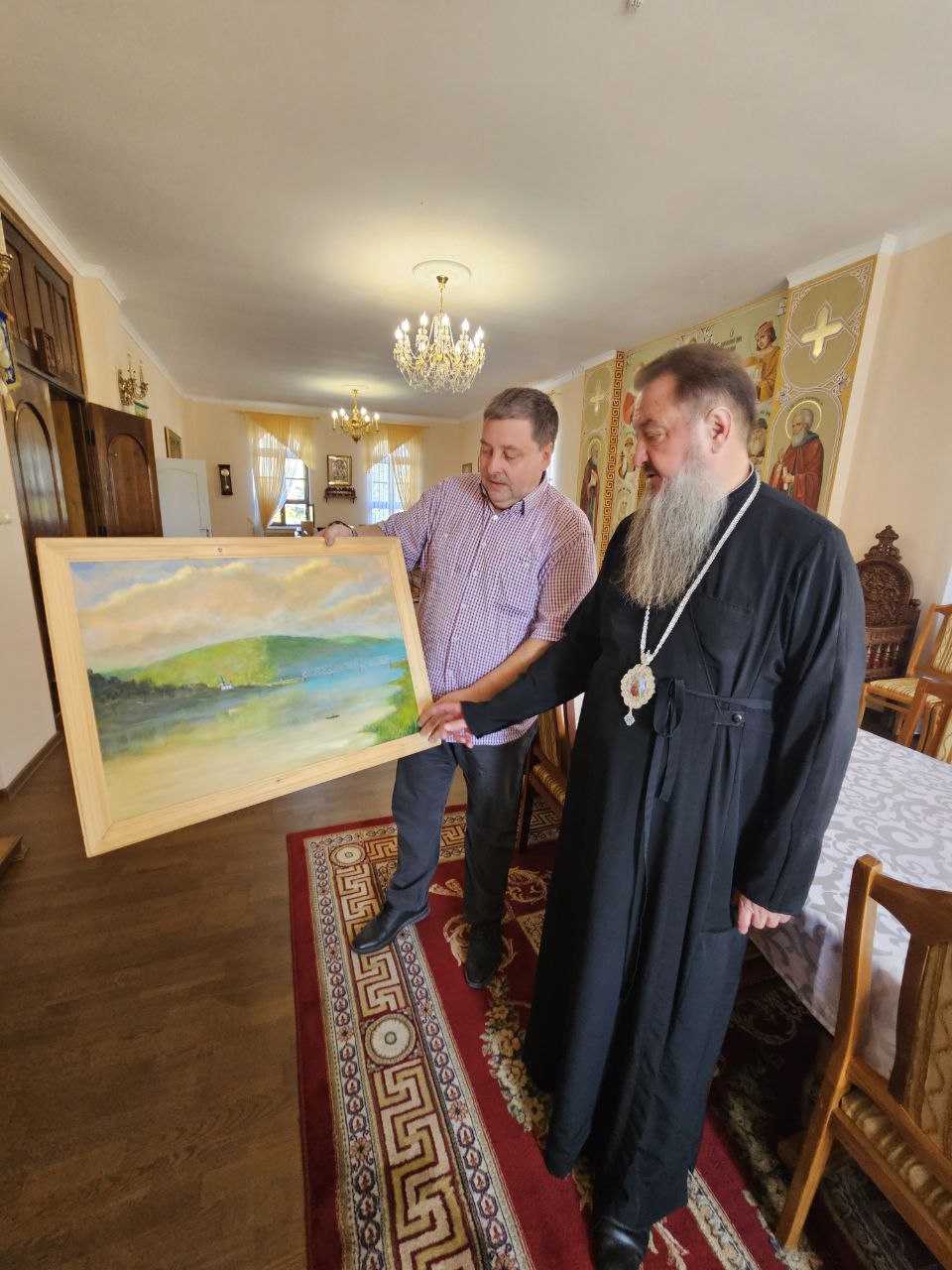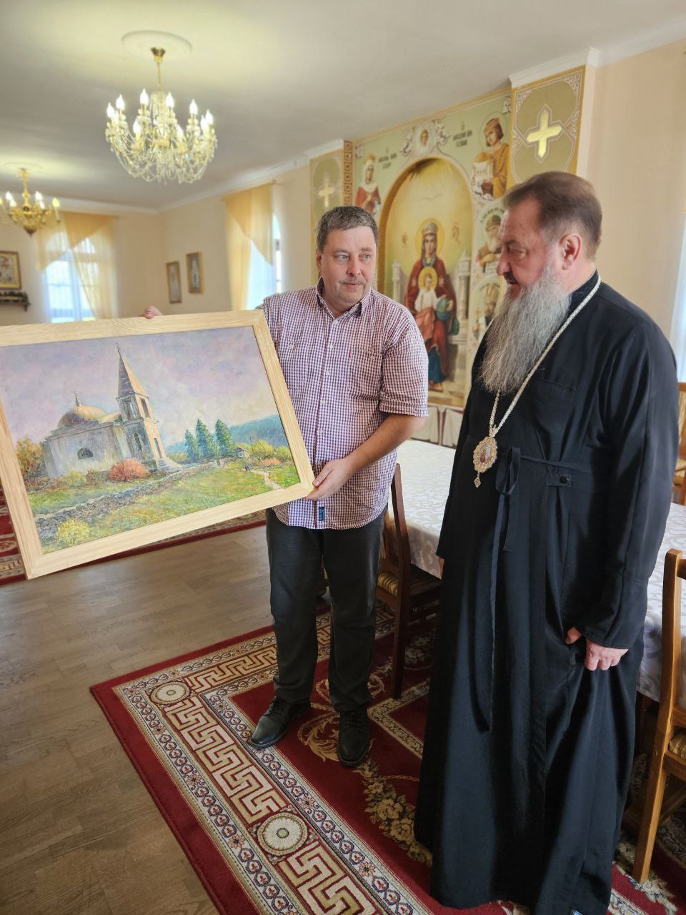 В завершение встречи советник Владыки Н. В. Дымченко, по поручению заслуженного художника ПМР В. Я. Завьялова, жителя Рыбницы, поздравил архиепископа с наступающей важной датой – 30-летием архиерейской хиротонии – и передал Владыке в дар три картины художника на церковную тематику.