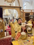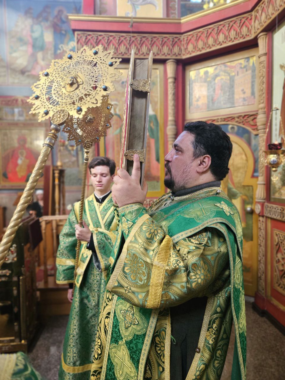 После великого славословия, Владыка Савва со служащим духовенством, совершил изнесение из Алтаря, украшенного живыми цветами Честнаго и Животворящего Креста Господня. При пении тропаря «Кресту Твоему поклоняемся, Владыко, и святое воскресение Твое славим», духовенство и миряне троекратно поклонились Святому Кресту, после чего, Правящий Архиерей помазал причт и прихожан освященным иелеем.