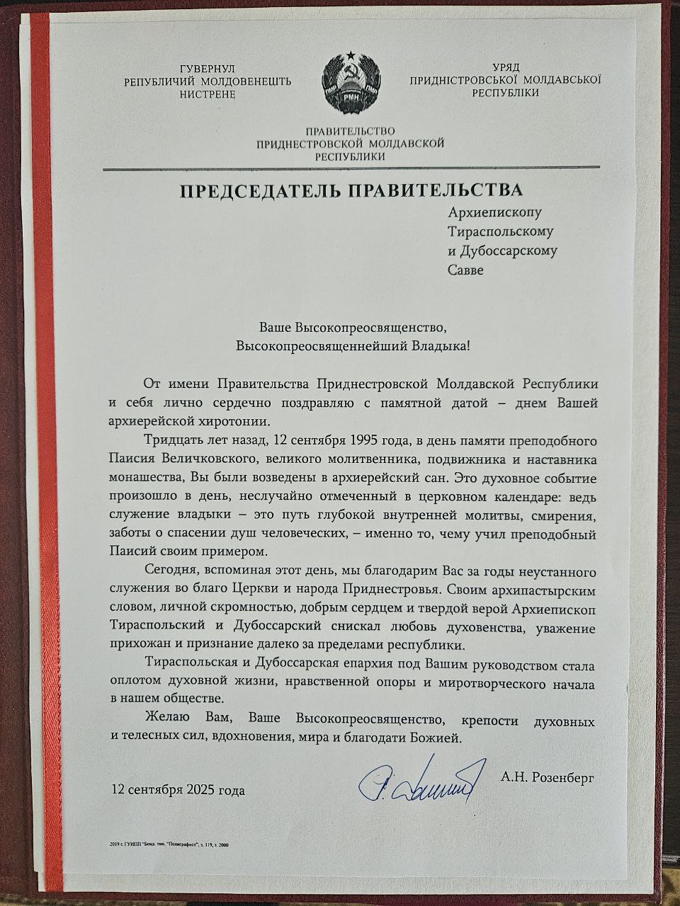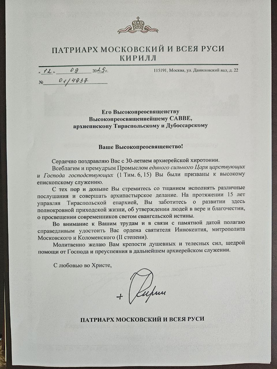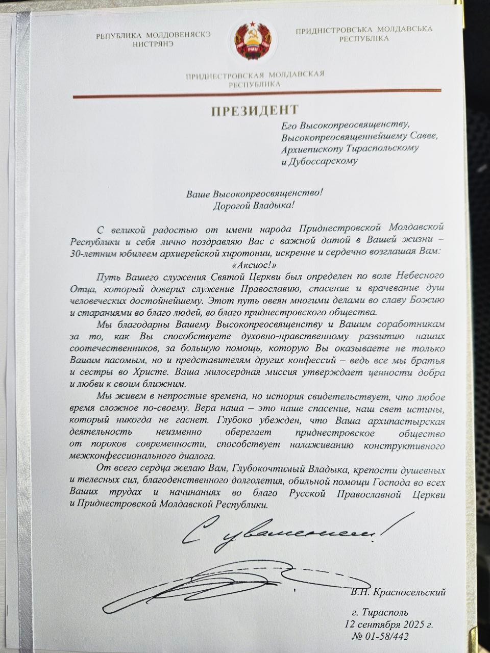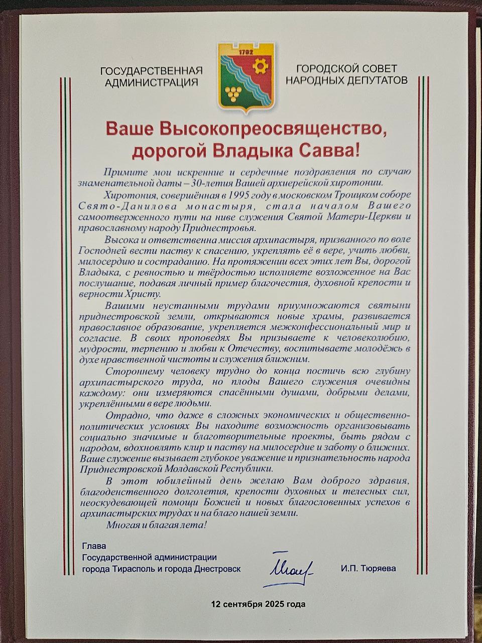 По случаю 30-летнего юбилея архиерейской хиротонии в адрес Правящего Архиерея Тираспольско-Дубоссарской епархии Высокопреосвященнейшего архиепископа Саввы поступили поздравления от Святейшего Патриарха Московского и всея Руси Кирилла, Президента ПМР В. Н. Красносельского, Председателя Правительства ПМР А. Н. Розенберга, главы Государственной администрации г. Тирасполя и г. Днестровска И. П. Тюряевой, руководителей городов и районов Республики, собратьев-Архиереев.