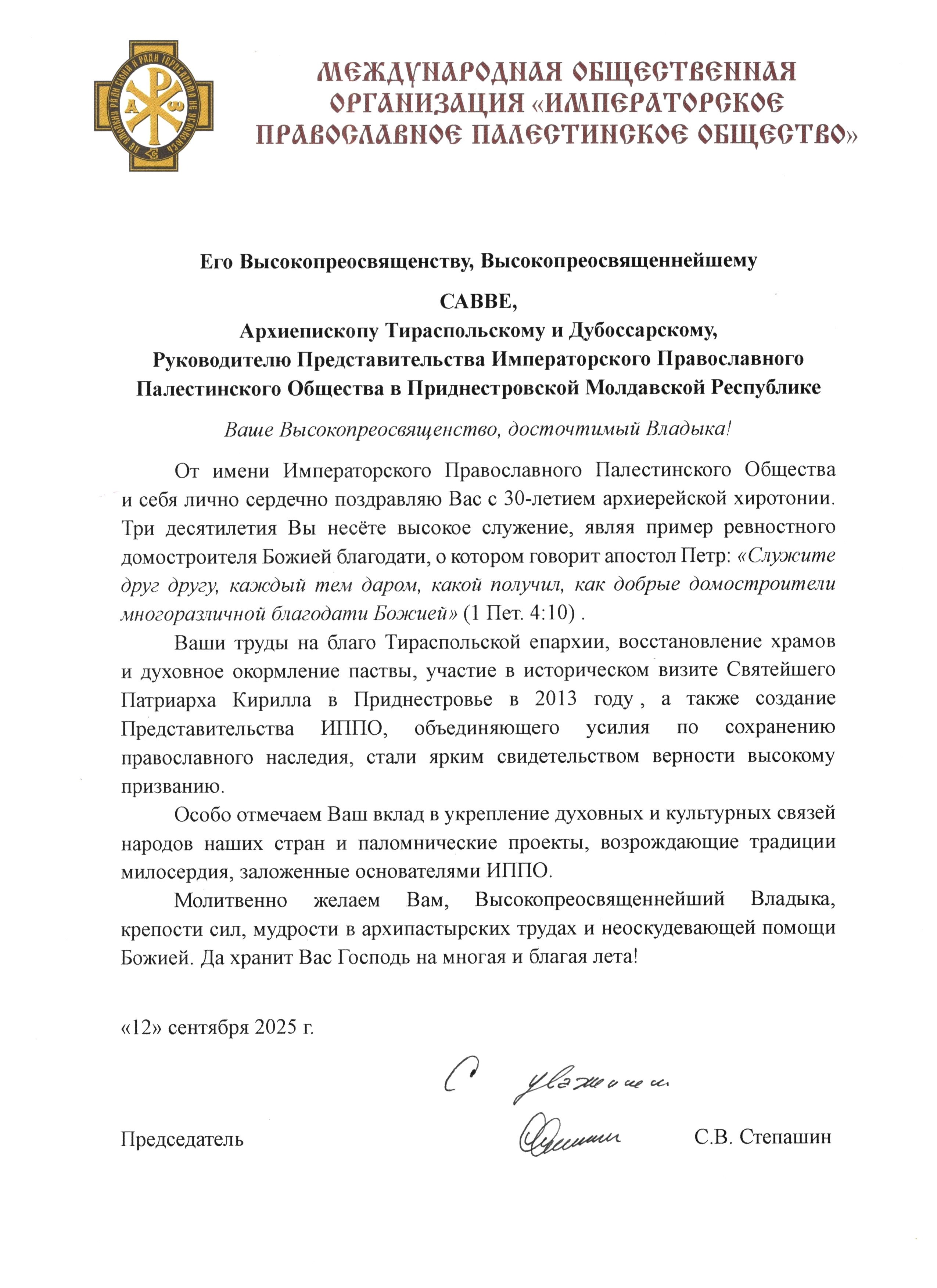 С юбилеем архиерейской хиротонии архиепископа Тираспольского и Дубоссарского Савву поздравил председатель Императорского Православного Палестинского общества (ИППО), известный государственный и общественный деятель, экс-премьер-министр России Сергей Вадимович Степашин, который направил владыке приветствие от имени ИППО.