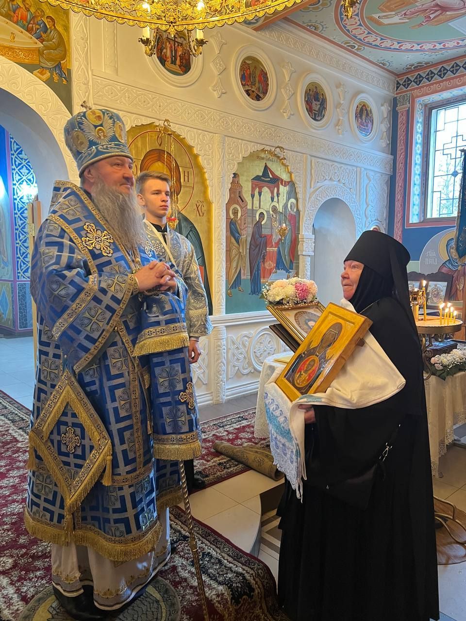 Игумения Пахомия выразила Правящему Архиерею благодарность за молитвенное участие в праздничных торжествах и преподнесла Владыке икону Божией Матери «Знамение», празднество в честь которой совершается 10 декабря.