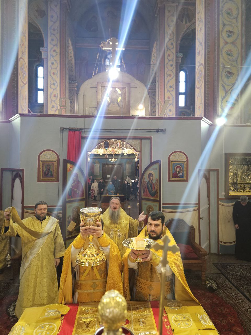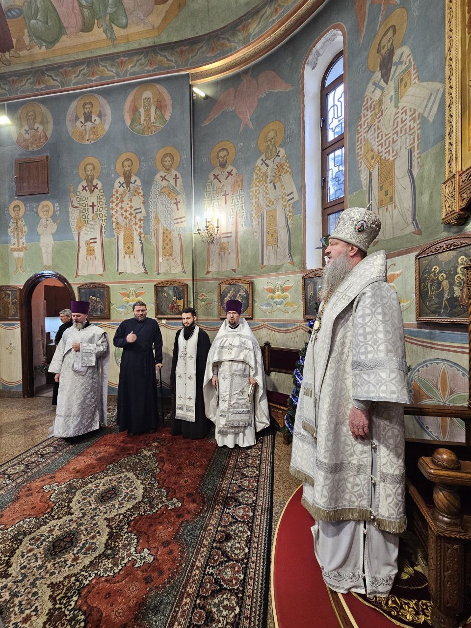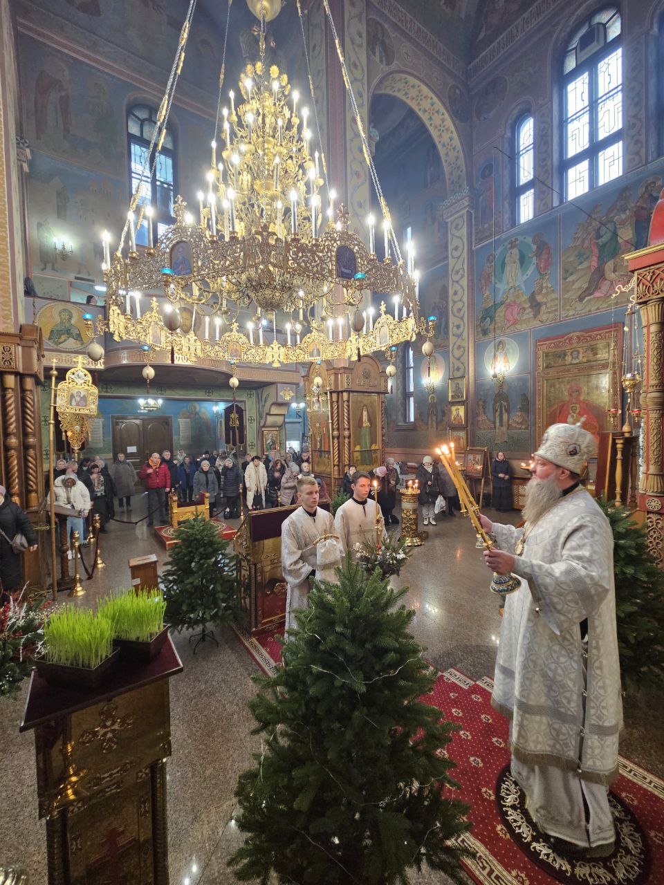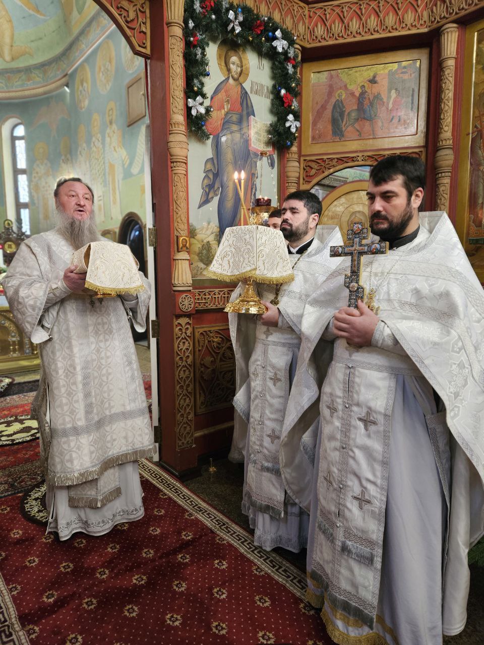 За богослужением Высокопреосвященнейшему Владыке настоятелю сослужили клирик прихода иеромонах Иоанн (Трайто) и клирик кафедрального собора Рождества Христова протодиакон Сергий Афтени. Совместная молитва духовенства и многочисленных прихожан стала духовным приготовлением к грядущему празднику Рождества Христова.