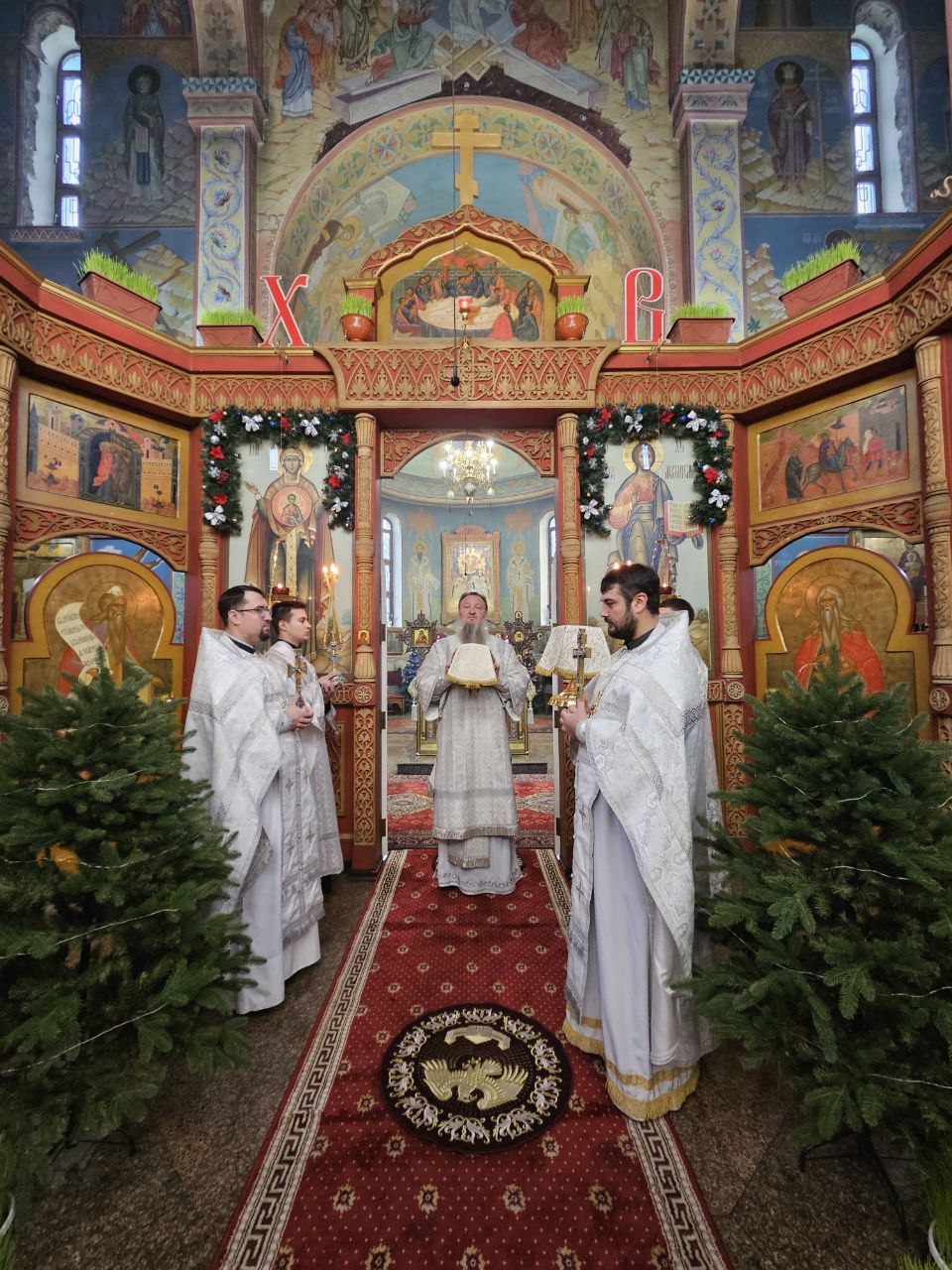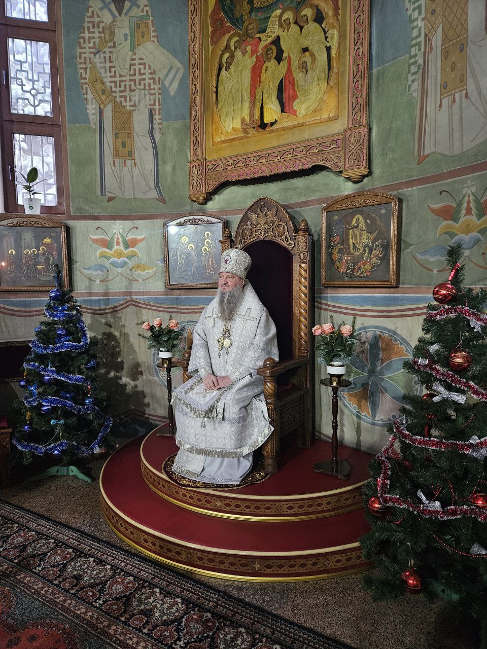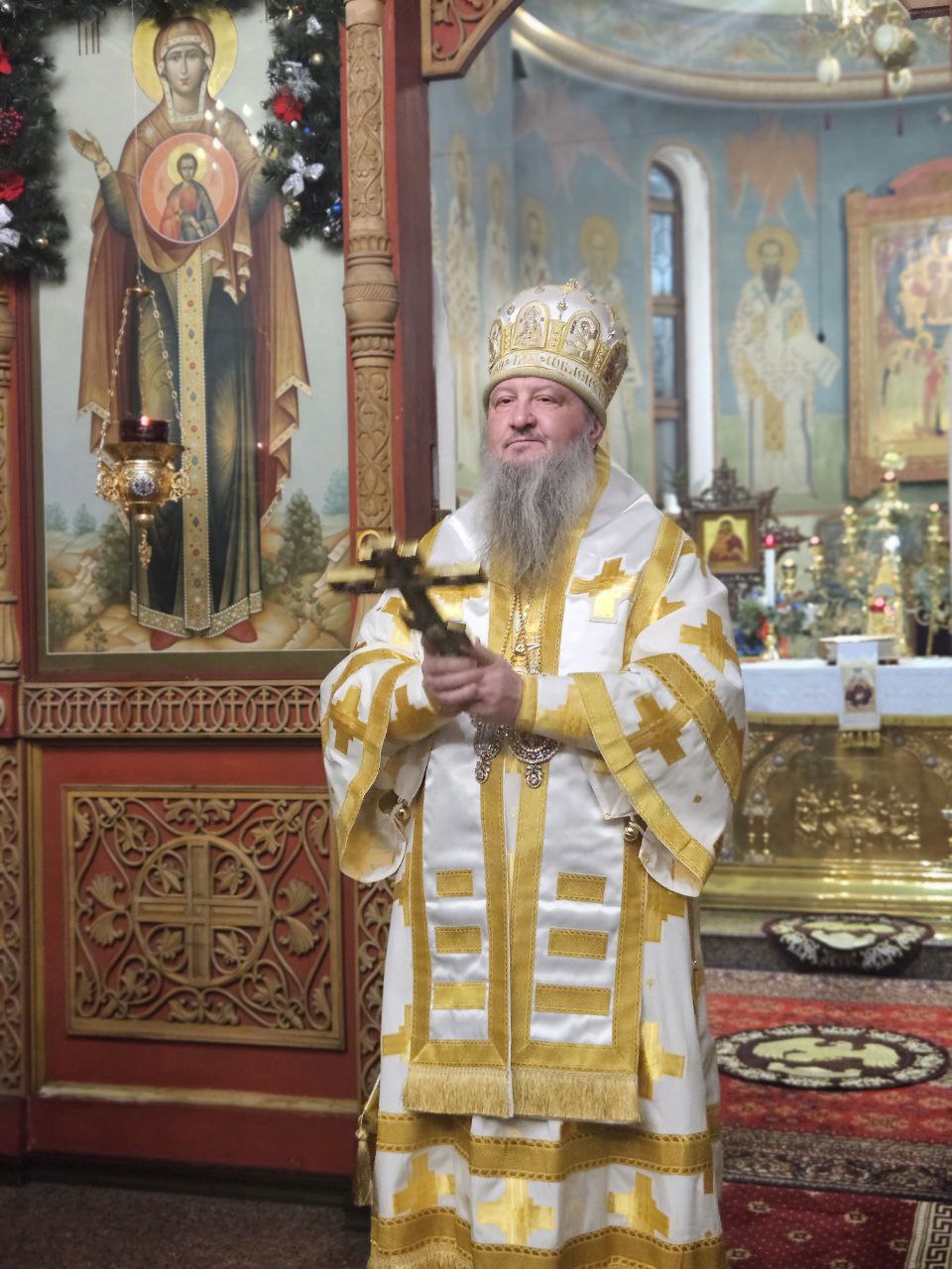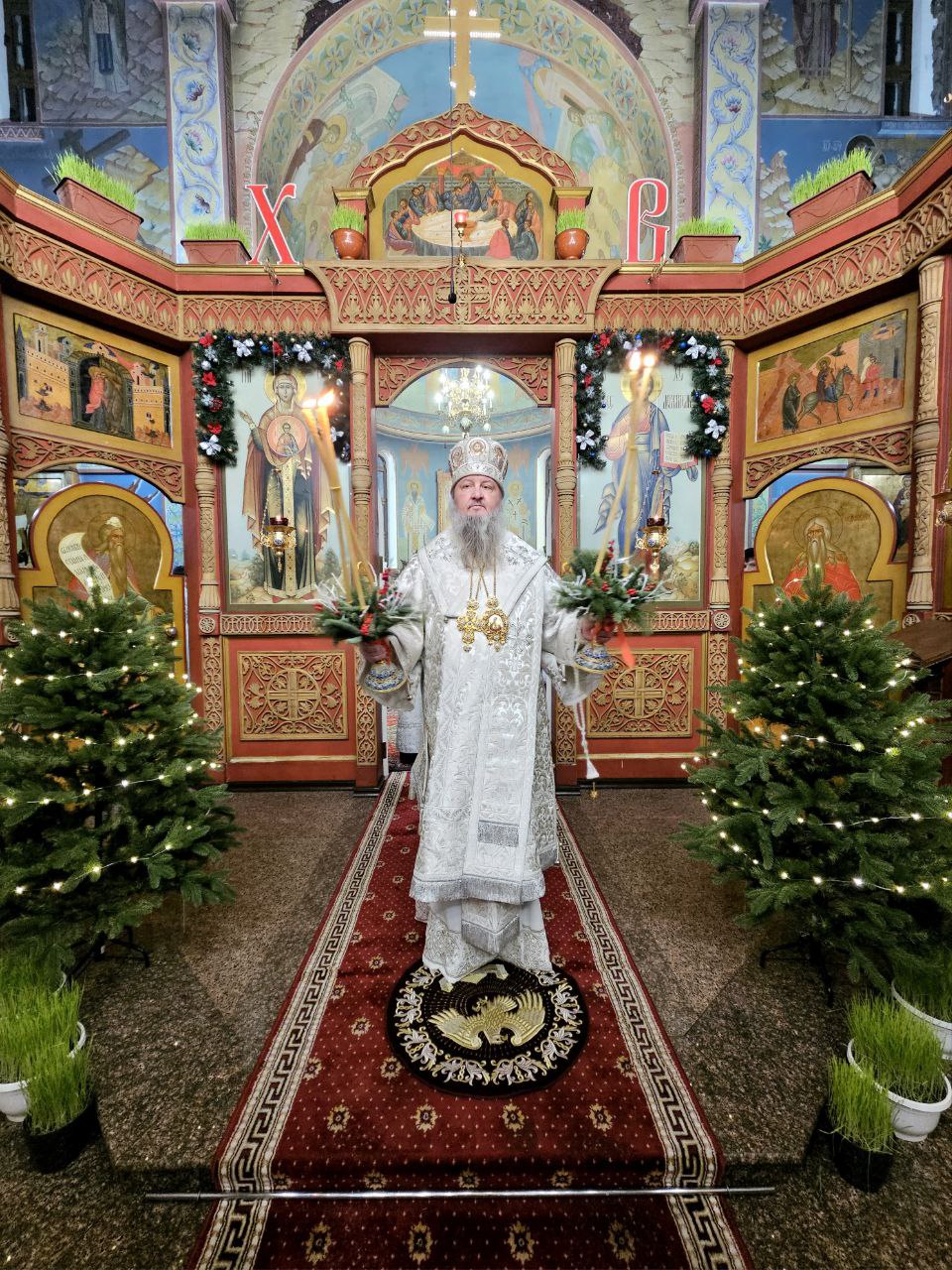 По окончании Божественной литургии было совершено славление празднику Рождества Христова, после чего Его Высокопреосвященство обратился к молящимся с архипастырским словом. Владыка призвал верующих откликнуться сердцем на великую любовь, явленную миру в Рождестве Спасителя, учиться всецело вверять свою жизнь Господу и с упованием предавать себя Его благому и спасительному Промыслу.