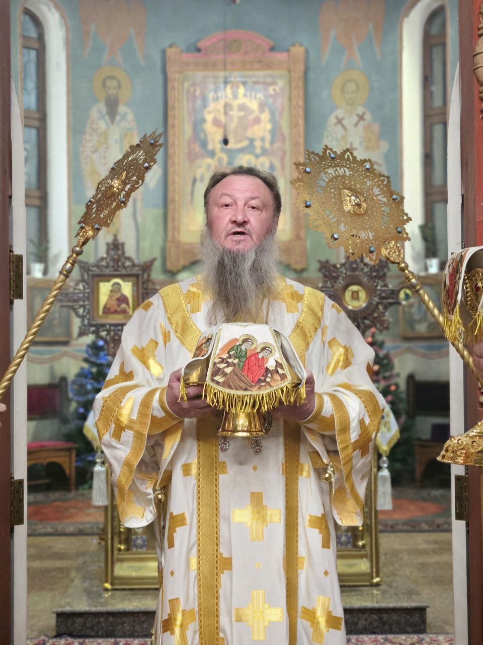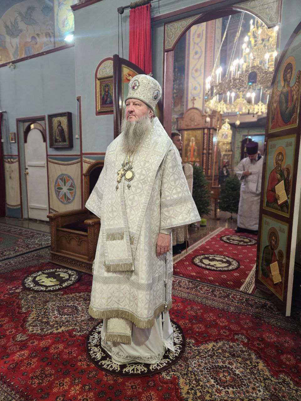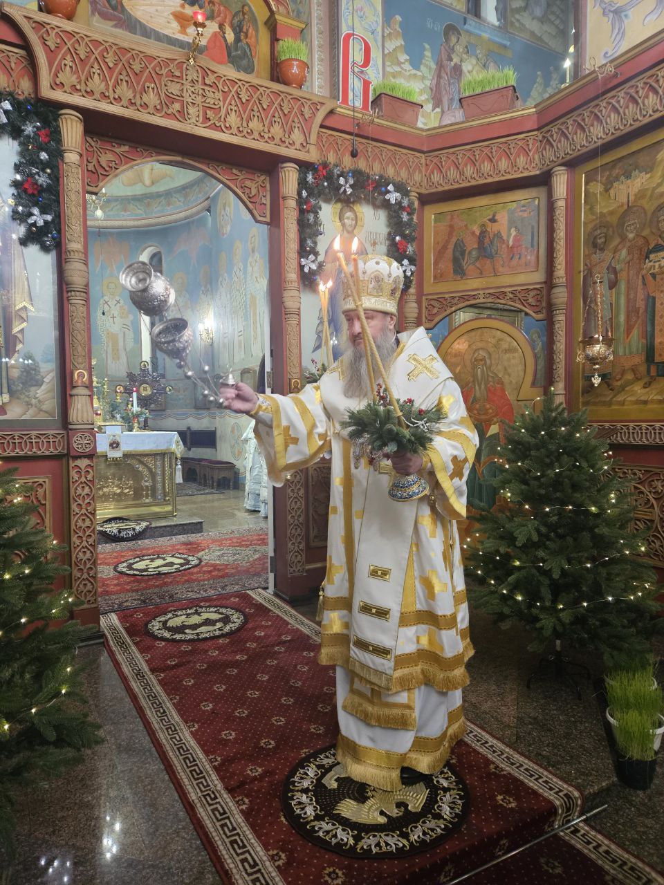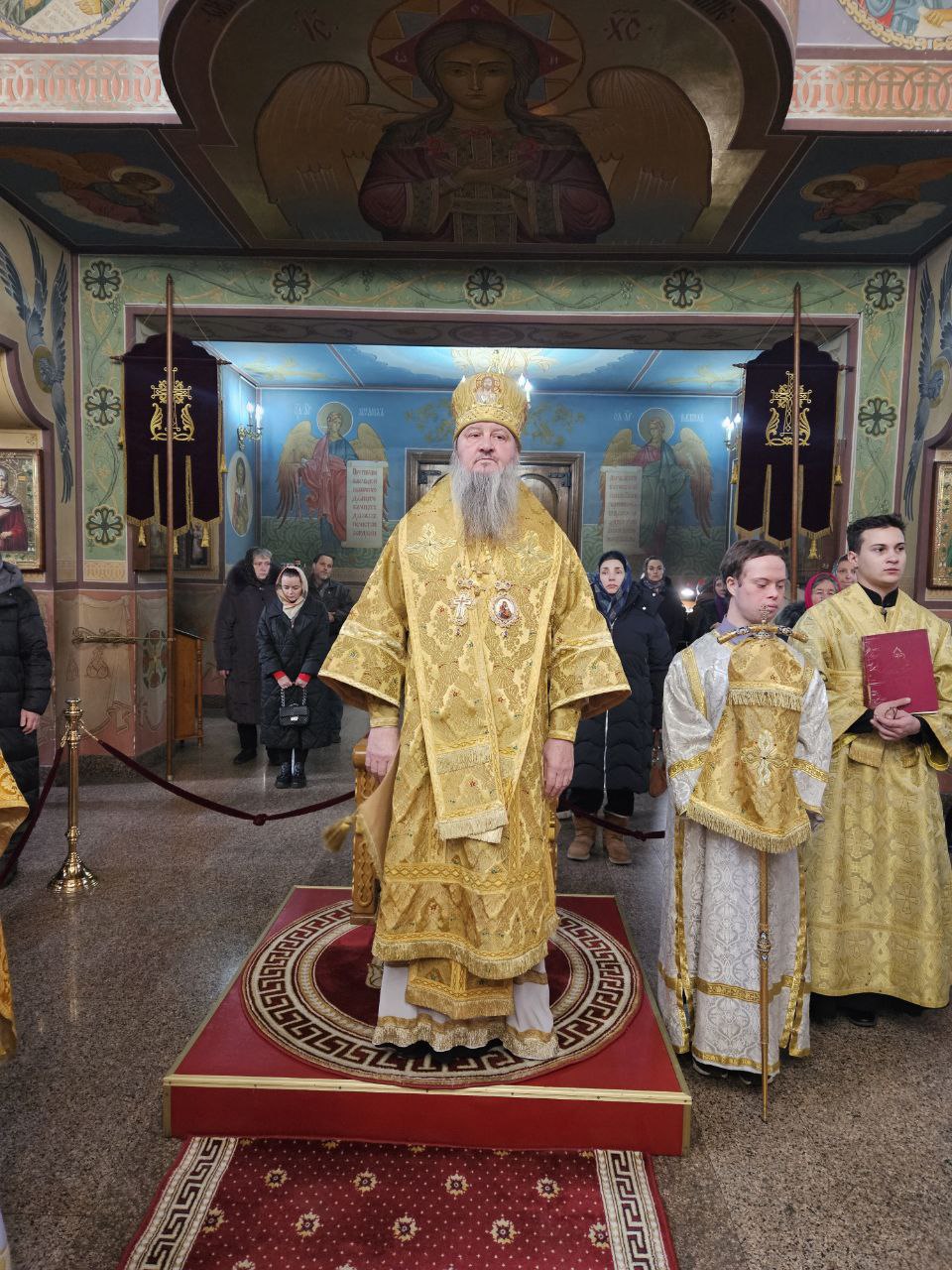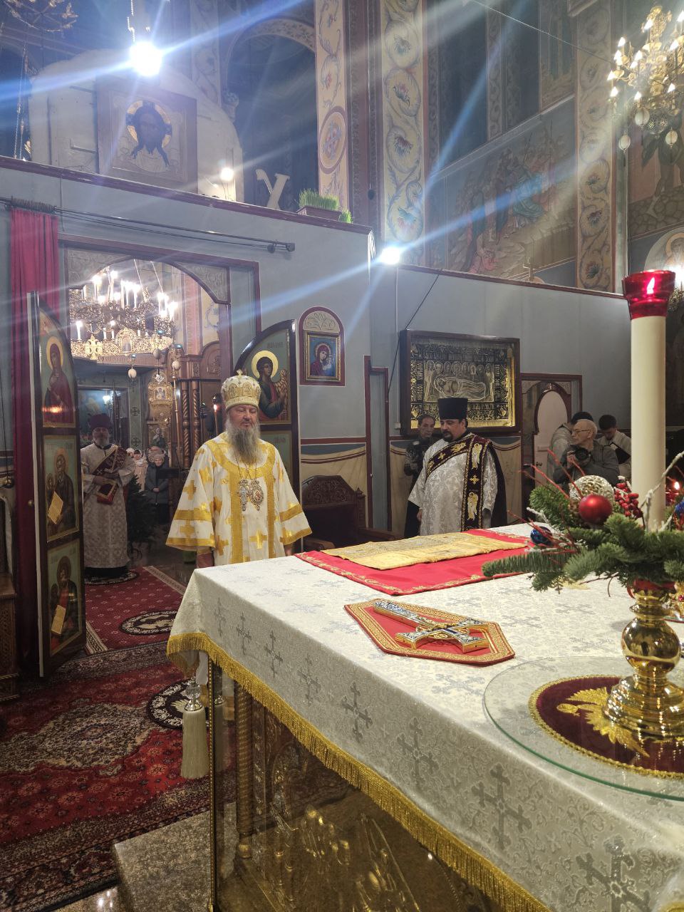 По окончании Божественной литургии было совершено славление празднику Рождества Христова, после чего Его Высокопреосвященство обратился к молящимся с архипастырским словом. Владыка призвал верующих откликнуться сердцем на великую любовь, явленную миру в Рождестве Спасителя, учиться всецело вверять свою жизнь Господу и с упованием предавать себя Его благому и спасительному Промыслу.