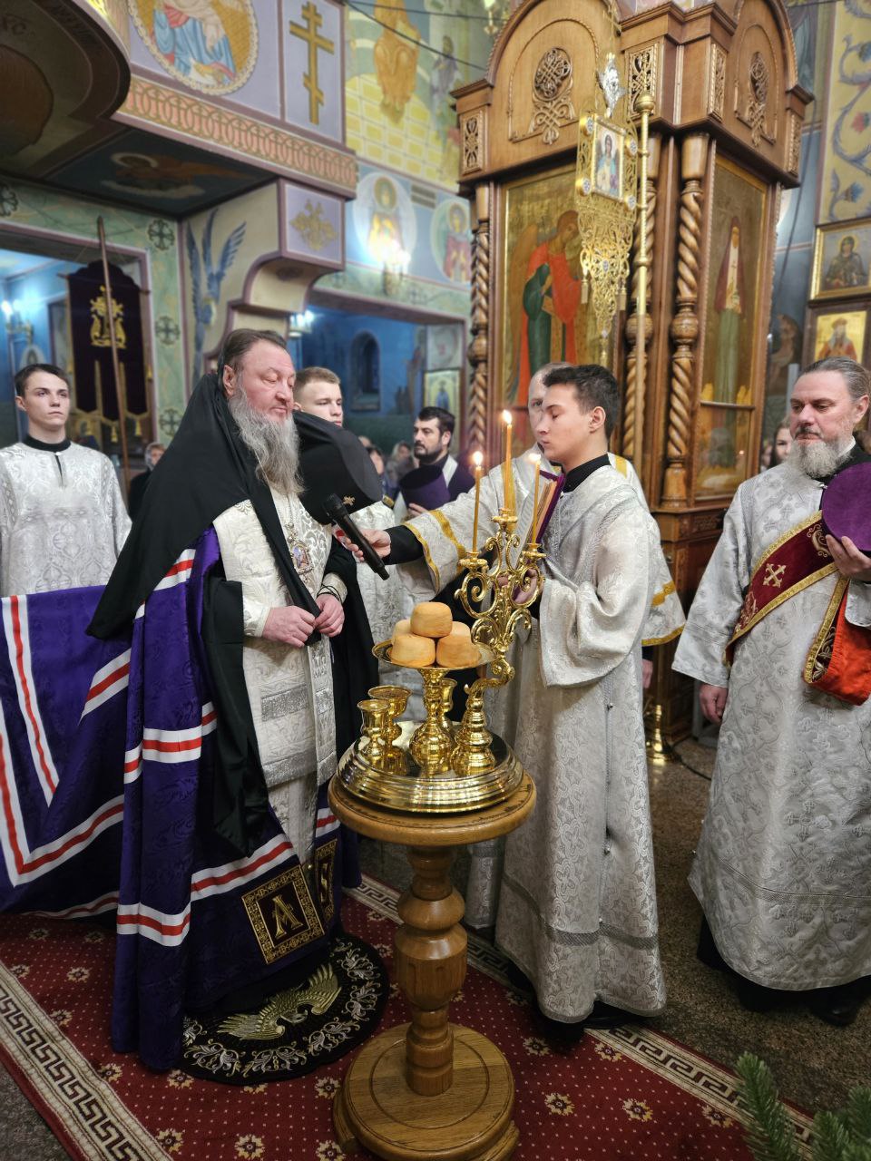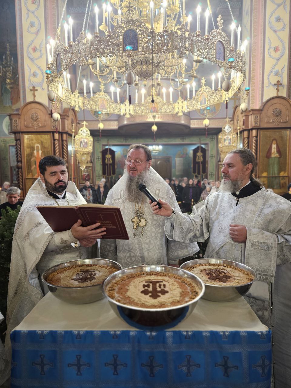 В завершение богослужения священнослужители во главе с Архиереем вышли к благолепно украшенной иконе праздника, где спели тропарь и кондак Рождества Христова. Затем Владыка освятил коливо – во укрепление телесных сил постящихся, так как по Уставу вкушать пищу разрешается уже после вечерни, которая в этот день совершается в соединении с литургией свт. Василия Великого.