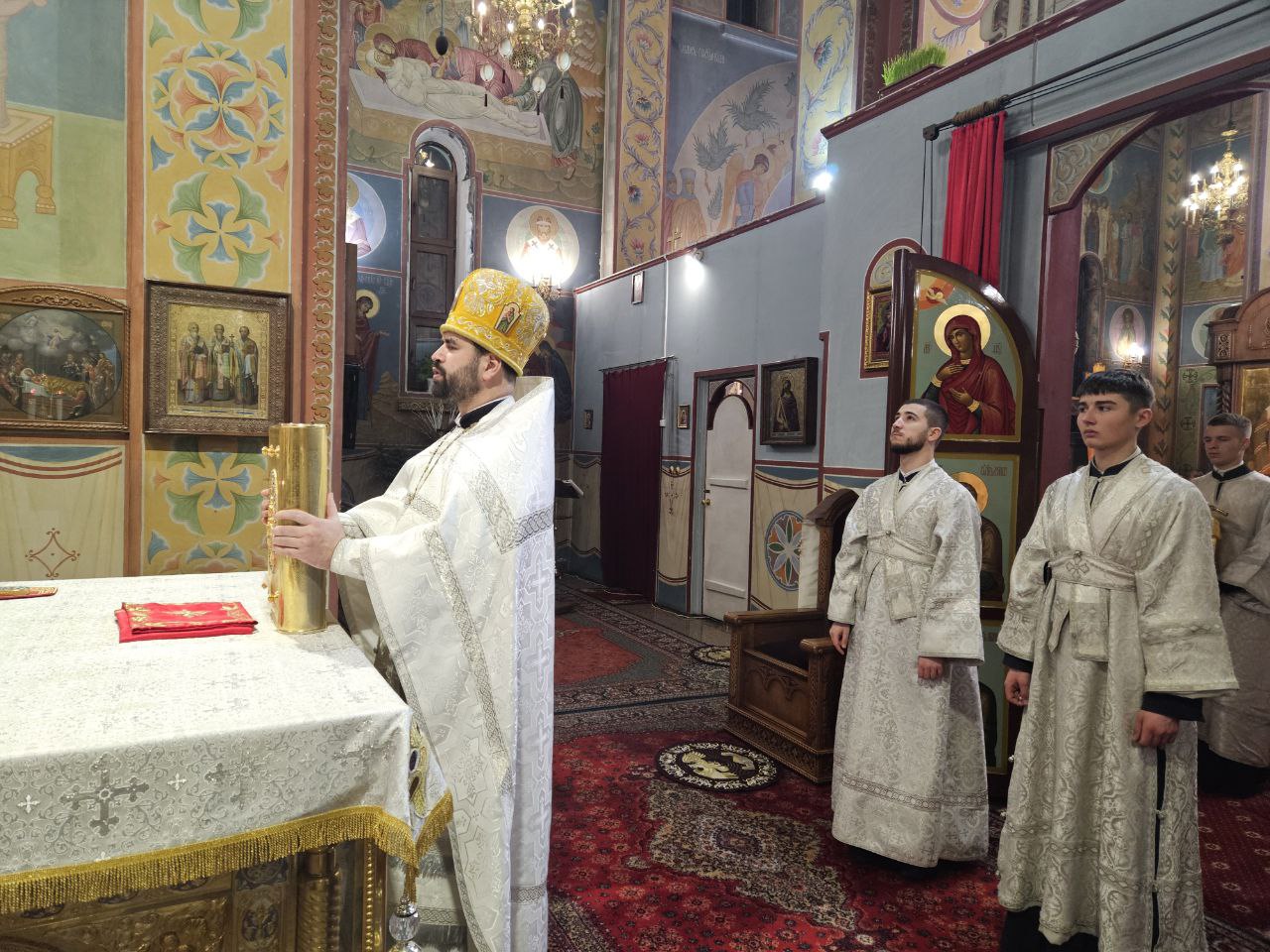 Правящему Архиерею сослужили ключарь и клирики кафедрального собора, настоятель Благовещенского прихода Тирасполя протоиерей Алексий Головаш, клирик столичного Покровского храма протоиерей Николай Чепель, настоятель домового храма иконы Божией Матери «Всех скорбящих Радость» при РКБ протоиерей Алексий Пантюшенко.