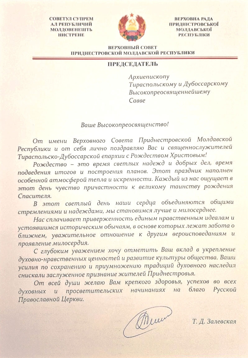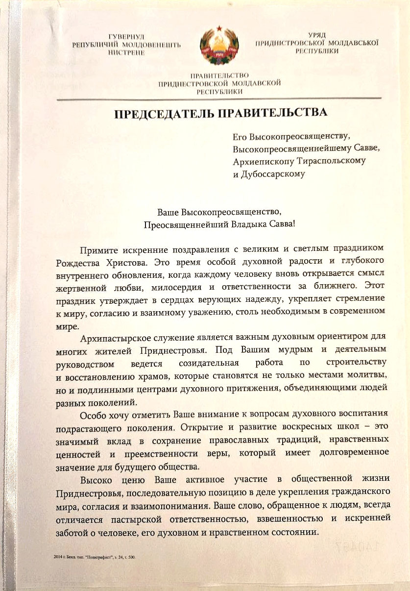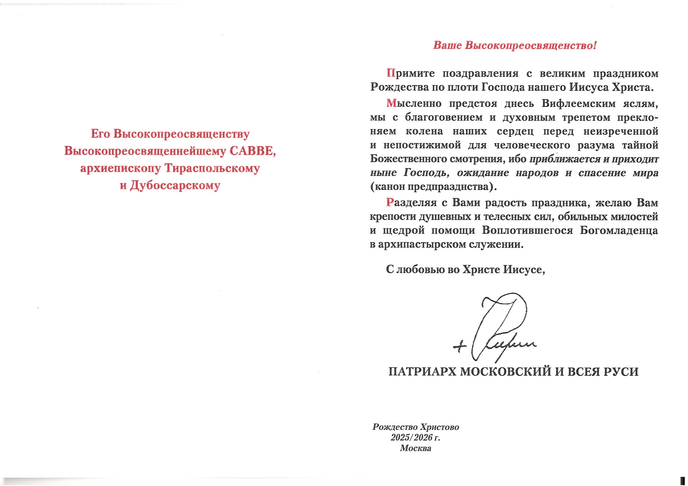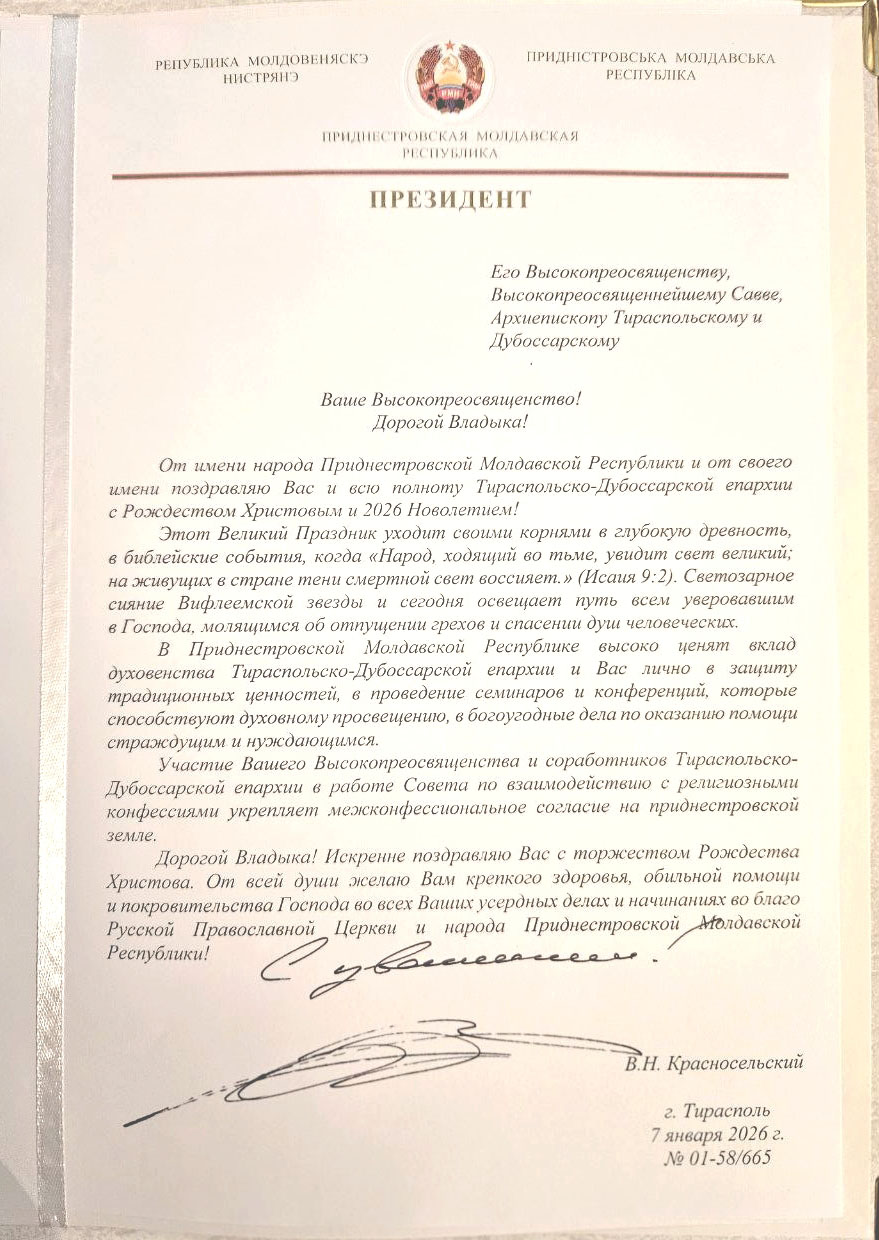 В дни светлого и спасительного праздника Рождества Господа Бога и Спаса нашего Иисуса Христа в адрес Его Высокопреосвященства, Управляющего Тираспольско-Дубоссарской епархией архиепископа Саввы, поступили поздравительные послания от Святейшего Патриарха Московского и всея Руси Кирилла, а также от первых лиц Приднестровской Молдавской Республики – Президента Вадима Николаевича Красносельского, Председателя Правительства Александра Николаевича Розенберга, руководителей органов государственной власти, министерств и ведомств, общественных организаций Приднестровья.