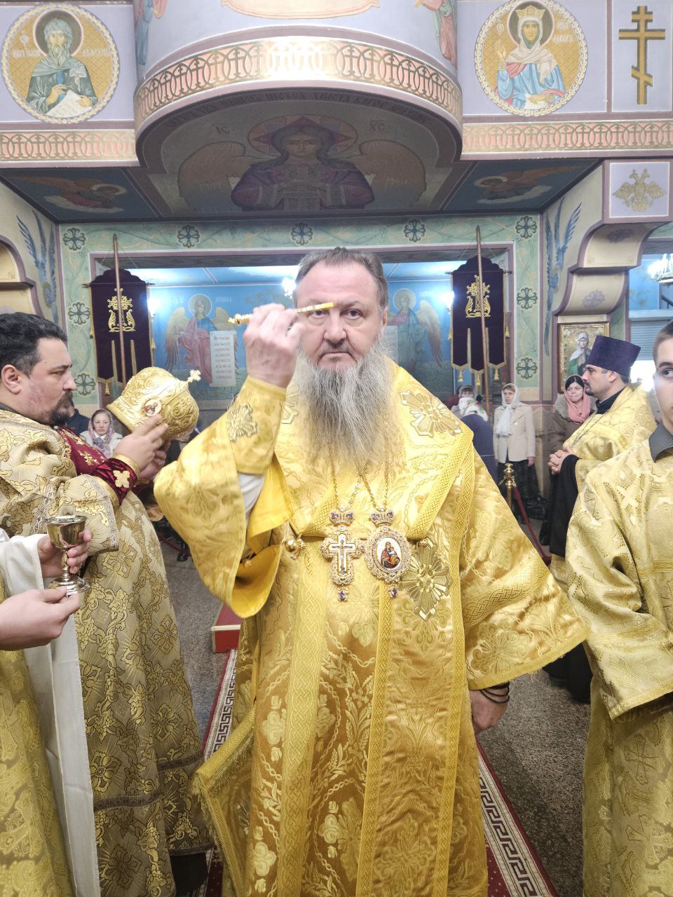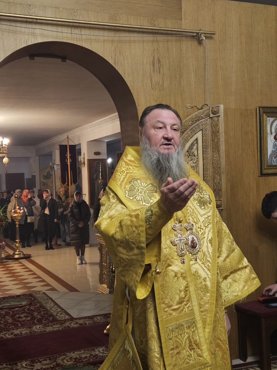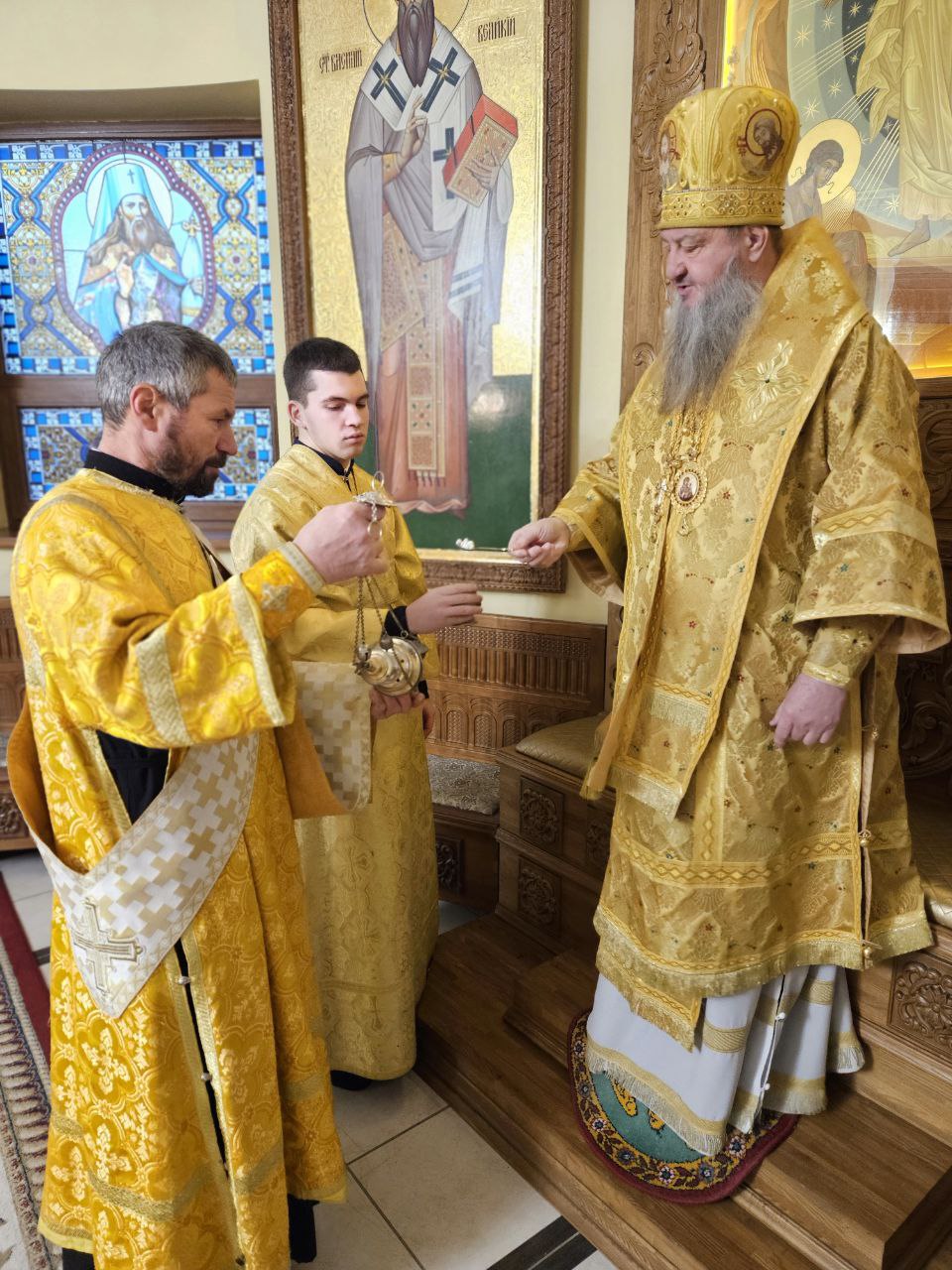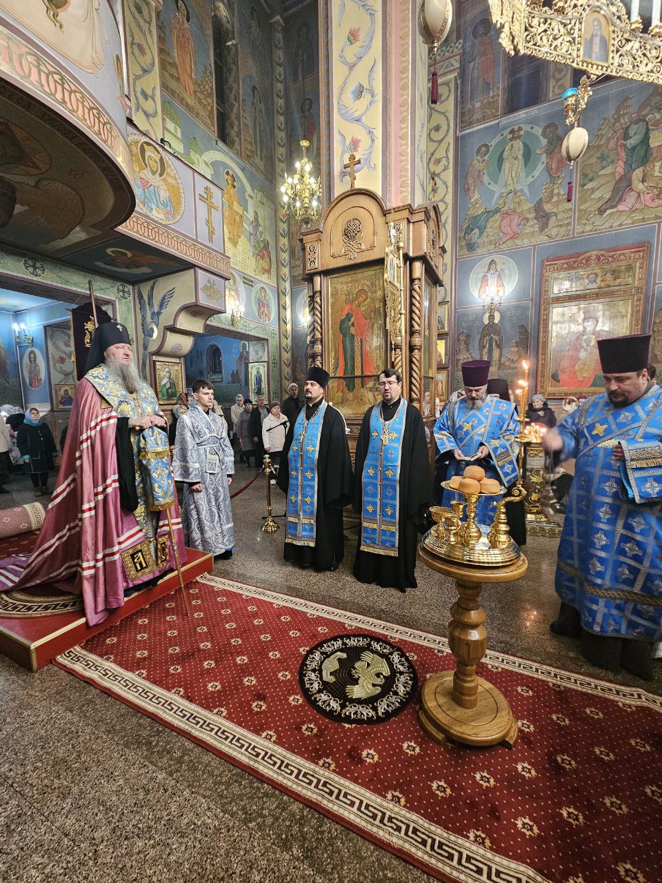 На полиелее Высокопреосвященнейшим Владыкой был прочитан положенный в дни памяти святителей отрывок из Евангелия от Иоанна (Ин. 10:1–9), после чего Архипастырь обратился к прихожанам, поздравив их с наступающим днём престольного праздника. Затем архиепископ Савва помазал святым елеем сослужившее духовенство и мирян.