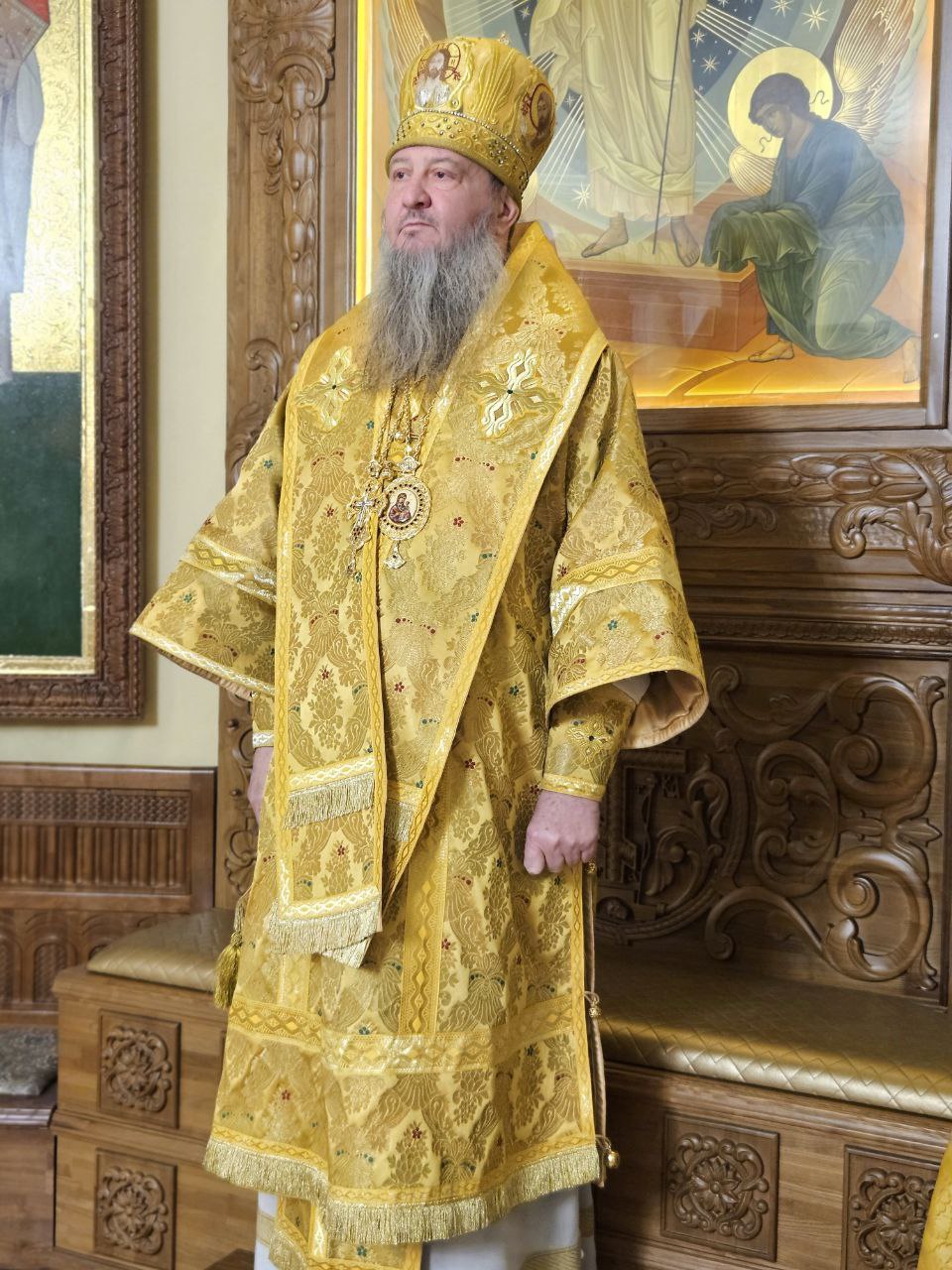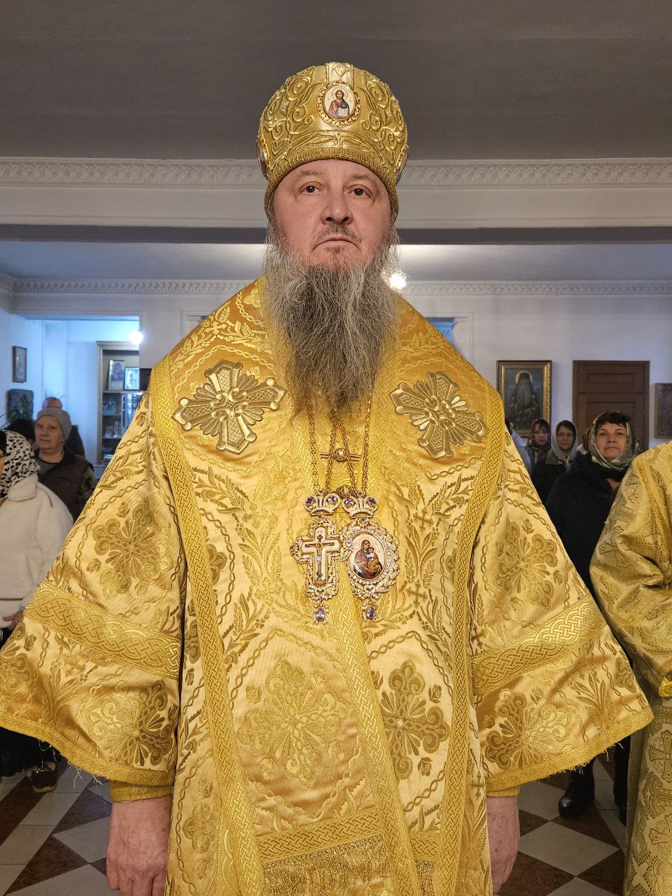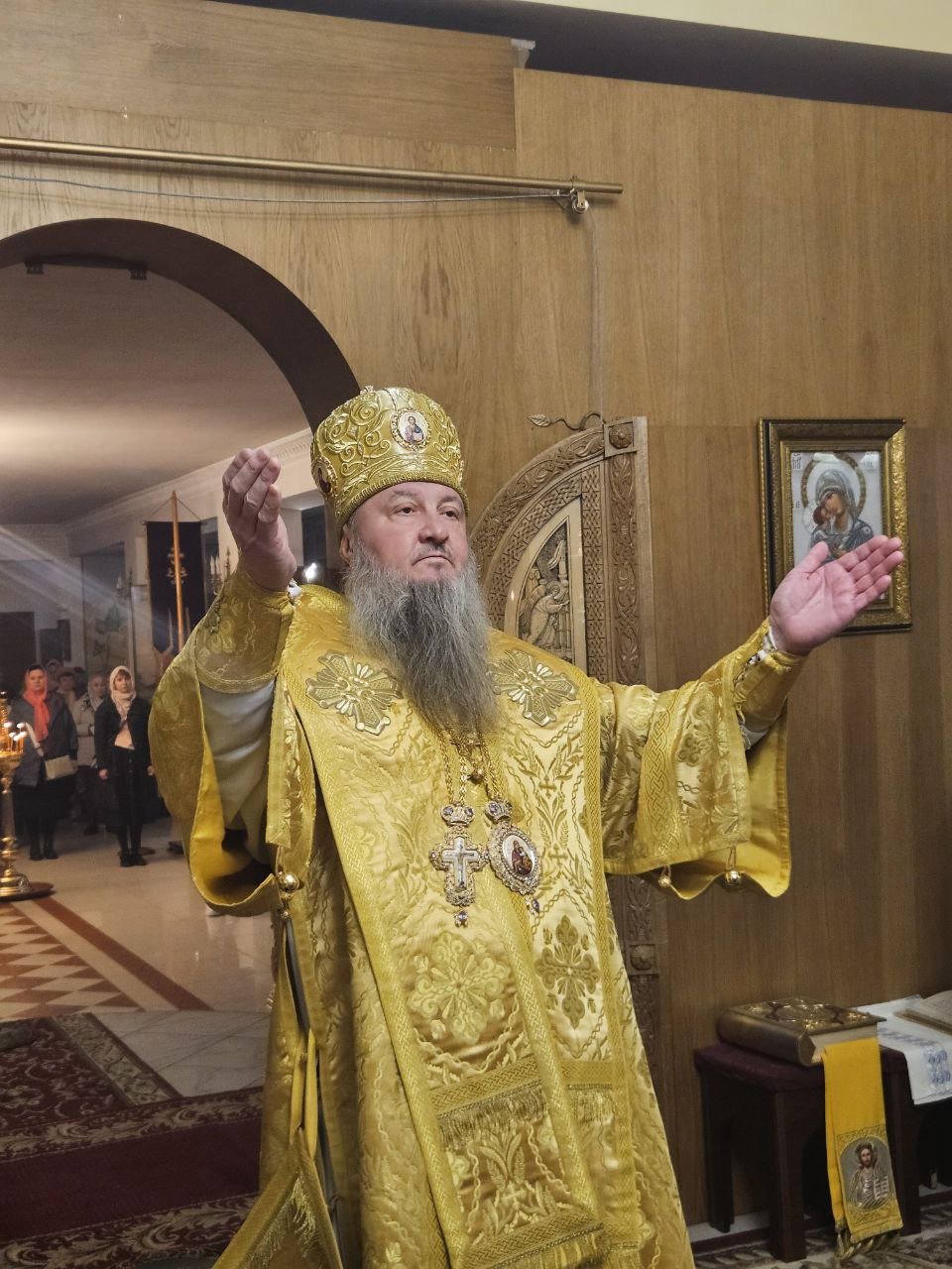 На полиелее Архипастырь прочёл отрывок из Святого Евангелия, читаемый за вечерним богослужением на праздники в честь Божией Матери (Лк. 1:39–49, 56). По полиелее Его Высокопреосвященство обратился к прихожанам, поздравив их с наступающим праздником, после чего помазал святым елеем духовенство и мирян.